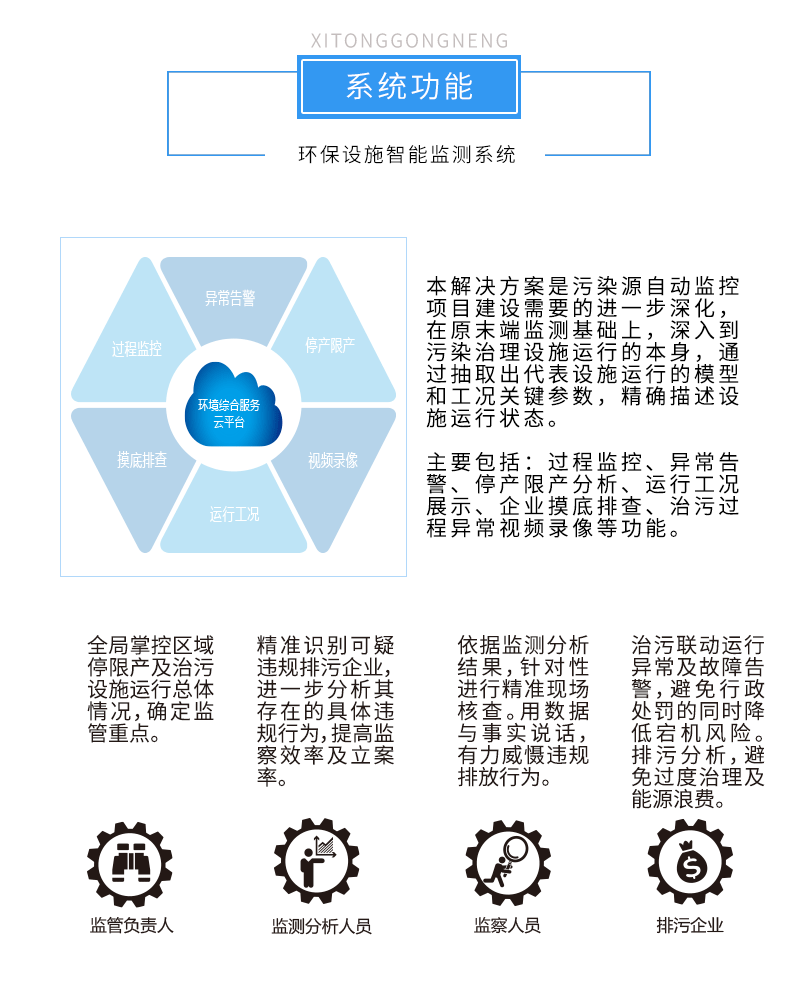 新聯(lián)環(huán)保設(shè)施智能監(jiān)測(cè)系統(tǒng)緊扣環(huán)保部門核心需求,集合大數(shù)據(jù)分析、云計(jì)算、移動(dòng)互聯(lián)網(wǎng)技術(shù),對(duì)企業(yè)生產(chǎn)設(shè)備與環(huán)保排污治理設(shè)備用電數(shù)據(jù)、運(yùn)行工況進(jìn)行24小時(shí)不間斷監(jiān)測(cè),通過(guò)數(shù)據(jù)分析、數(shù)據(jù)挖掘,實(shí)現(xiàn)模型分析告警、精準(zhǔn)監(jiān)察、高效監(jiān)管,為環(huán)保稽查提供全方位數(shù)據(jù)支撐。變?nèi)朔罏樾畔⒒挤?、?jì)劃監(jiān)察為狀態(tài)監(jiān)察、事后處罰為介入式執(zhí)法徹底扭轉(zhuǎn)傳統(tǒng)依靠人力、經(jīng)驗(yàn)及結(jié)果監(jiān)測(cè)數(shù)據(jù)進(jìn)行現(xiàn)場(chǎng)核查的狀態(tài),實(shí)現(xiàn)了從“點(diǎn)末端監(jiān)控”向“全過(guò)程監(jiān)控”擴(kuò)展。立足用戶價(jià)值,打造環(huán)保設(shè)施管理一站式服務(wù)。