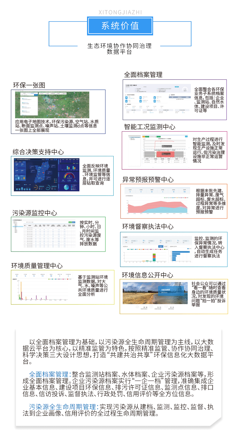 數(shù)據(jù)共享:強(qiáng)化數(shù)據(jù)共享,優(yōu)化業(yè)務(wù)流程,整合監(jiān)測(cè)、監(jiān)控、執(zhí)法、管理等環(huán)境要素形成一個(gè)有機(jī)的整體,促進(jìn)工作協(xié)同和一體化發(fā)展,提高機(jī)構(gòu)工作效率,有效解決環(huán)境管理“應(yīng)用煙囪”和“信息孤島”問(wèn)題。對(duì)環(huán)境信息進(jìn)行全方位、全過(guò)程、可視化綜合展示及鉆取分析,使環(huán)境狀況及業(yè)務(wù)管理信息清晰、準(zhǔn)確、透明,增強(qiáng)環(huán)境決策的科學(xué)性。